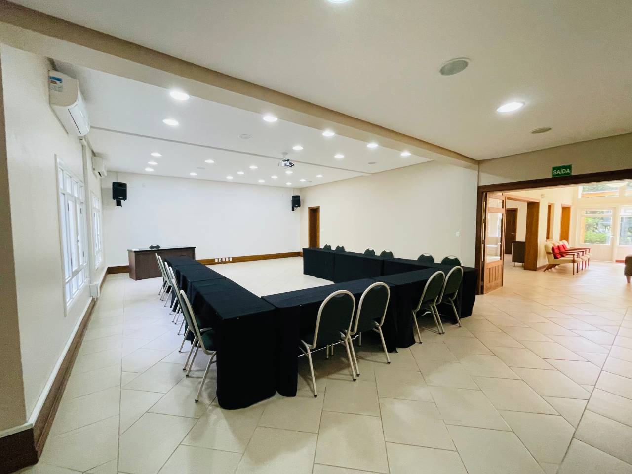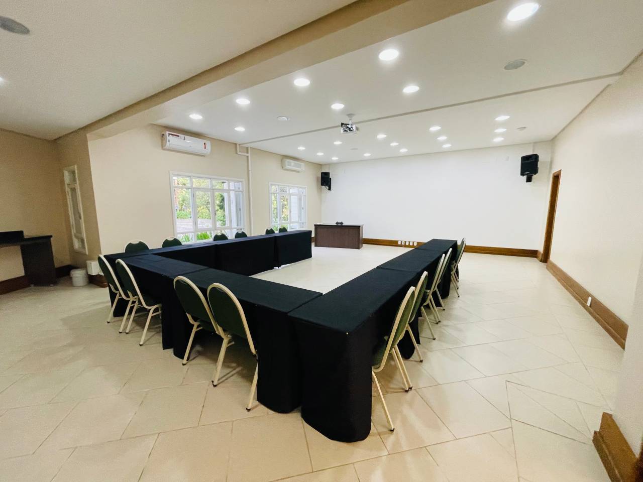 Este espaço aconchegante e funcional acomoda até 50 pessoas em formato de auditório. Conta com: Uma sala de convenções; Uma antessala; Uma sala para coffee break; Uma sala de apoio; Banheiros masculino, feminino e adaptado para pessoas com deficiência.
